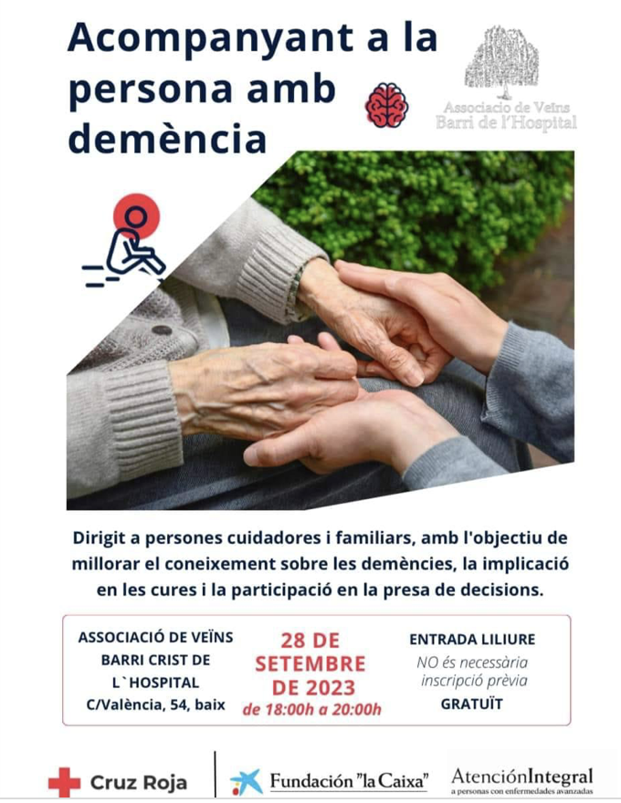 Creu Roja organitza una xarrada a càrrec de Francisco Javier Morales González, psicòleg de l’equip d’Atenció Psicosocial de Creu Roja. És dirigida a persones que tinguen a prop familiars amb alguna demència o persones cuidadores. Es realitzarà en els locals de l’Associació de Veïns del Barri de l’Hospital aquest dijous 28 de setembre de les 18:00 h a 20:00 h.