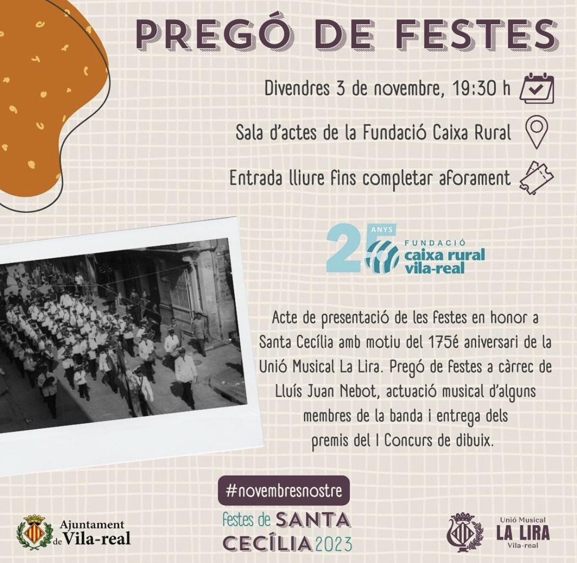 El pròxim divendres 3 de novembre tindrà lloc l’acte de presentació de festes en honor a Santa Cecília amb motiu del 175é aniversari de la Unió Musical La Lira. El pregó de festes serà a càrrec de Lluís Juan Nebot. També hi haurà una actuació musical d’alguns membres de la banda i l’entrega dels premis del I Concurs de dibuix. Serà a les 19:30 al saló d’actes de la Caixa Rural i l’entrada és lliure fins a completar l’aforament.