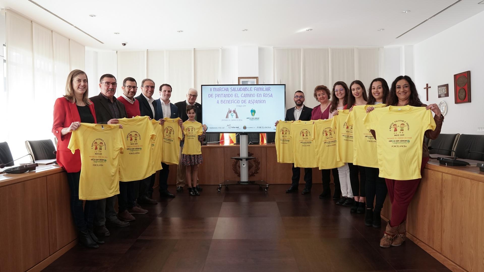 Aquest matí l’Ajuntament de Vila-real ha albergat la presentació de la samarreta de la Marxa Saludable que organitza Aspanion per al proper 19 de maig, durant les festes en honor a Sant Pasqual. L’acte ha tingut lloc a la sala de plens, on han estat presents l’alcalde, José Benlloch, i el regidor de Festes, Diego Vila, juntament amb representants de la Junta de Festes, la reina i dames, membres d’Aspanion, Carrefour, Porcelanosa i el Villarreal CF, que col·laboren amb l’activitat. Les samarretes es poden adquirir per 6 euros a les tendes oficials del Villarreal CF, Canem Moda, Niuet i comerços locals col·laboradors. També hi haurà una parada d’Aspanion al mercat a partir d’ara on es podrà aconseguir. La marxa, apta per a totes les edats, començarà a les 11.00 hores a la plaça del Llaurador el proper 19 de maig i arribarà fins al Termet, on hi haurà una activitat de ‘Jugant, jugant’, activitats esportives i es podran adquirir entrepans i begudes per un euro. La samarreta també es podrà adquirir a la plaça del Llaurador abans d’eixir i tot el que es recapte anirà íntegrament per a finançar el campament d’estiu dels xiquets amb càncer, a Xèrica.
