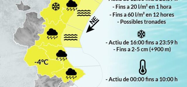 El servei meteorològic ha emès un avís groc per pluges intenses que poden afectar la nostra zona en les pròximes hores. Les autoritats recomanen extremar les precaucions, especialment en la conducció i en aquelles activitats a l’aire lliure que puguen veure’s afectades per l’aigua acumulada.
