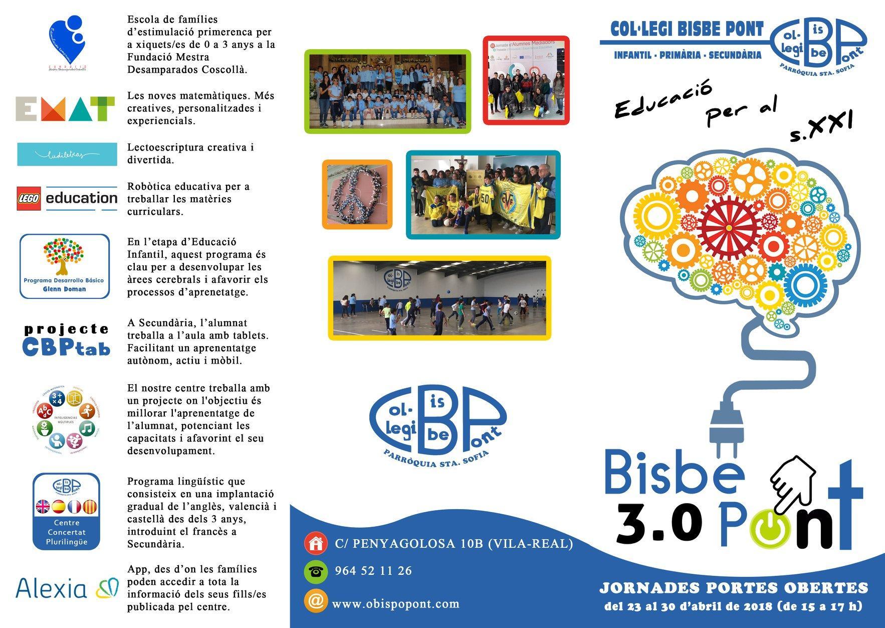 resposta a l’absència de centres escolars en un barri popular dels afores de la ciutat. La seua funció integradora perdura hui dia i és sense dubte una de les seues principals característiques. Ser un centre concertat basat en valors cristians no ha impedit que persones de diferents creences l’hagen triat, ja que la discriminació no té cabuda i s’aposta per la gratuïtat a diferència d’altres escoles concertades. Fa dos anys l’escola va viure un dels moments més durs de la història i és que la continuïtat de la unitat d’Infantil es va veure amenaçada per una ordre de tancament per part de la Conselleria d’Educació. La ciutadania es va mobilitzar de forma unànime explotant el ressò i la visibilització que proporcionen les xarxes socials i van dir a una sola veu que el Bisbe Pont no es tancava i la pressió va fer que el mateix conseller, Vicent Marzà, telefonara a l’escola de la decisió de paralitzar el procés, que haguera significat el principi del fi. Afortunadament tot això ha quedat en un malson i el centre celebra enguany el seu 50 aniversari amb diverses activitats i projectes, un d’ells l’exposició commemorativa de l’efemèride.