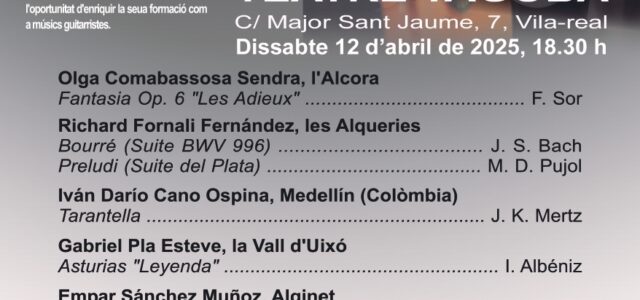 Seguint la filosofia artístic-musical de Manuel Babiloni, el dissabte 12 d’abril a les 18.30 hores es celebrarà un concert d’alumnes dins del marc del IV Taller d’Interpretació Musical, impartit pel guitarrista Óscar Ebro Nebot. L’esdeveniment tindrà lloc al Teatre Tagoba.