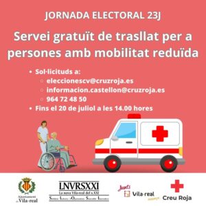 Creu Roja, en col·laboració de l’ajuntament de Vila-real i d’altres entitats, ha posat en marxa un servei per a permetre que les persones ingressades en hospitals i residències o les persones amb problemes de mobilitat disposen d’un servei de trasllat gratuït als col•legis electorals per a la jornada d’eleccions generals del 23 de juliol.