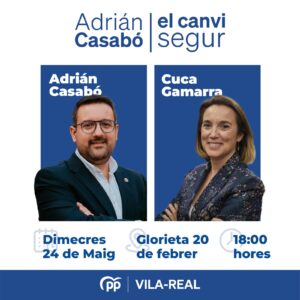 El candidat del Partit Popular a l’alcaldia de Vila-real, Adrián Casabó, estarà acompanyat per la secretària general del PP i portaveu del Grup Popular en el Congrés, Cuca Gamarra, en un acte que tindrà lloc en la Glorieta 20 de febrer dimecres que ve 24 de maig a les 18.00 hores.