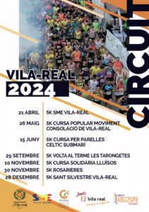 Després de la gala de premis que tindrà lloc l’11 d’abril a les 20.00 hores a l’Auditori Municipal Músic Rafael Beltrán Moner, el circuit arrancarà el 21 d’abril amb el 5K de l’SME; el 26 de maig se celebrarà la 5K carrera popular Moviment Consolació; el 15 de juny tornarà la carrera per parelles del Celtic Submarí, un 6K; el 29 de setembre arribarà la Volta al Terme dels Tarongetes; al novembre, el circuit continuarà amb la carrera solidària Lluïsos (10 de novembre) i el 5K de les Rosarieres (30 de novembre); finalment, el circuit de 2024 es tancarà amb la tradicional Sant Silvestre, del Trivila Club, el 28 de desembre. La informació i inscripcions estan disponibles en https://www.circuitcarrerespopularsvila-real.com