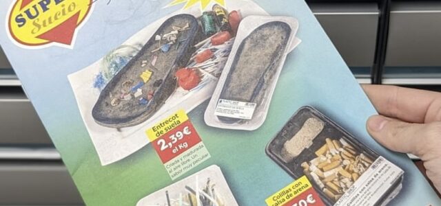 Es tracta d’un fullet similar al d’un supermercat en el que s’alerta: “Nuevo en Vila-real, de la tierra y el mar a tu mesa”. A les imatges es poden vore aliments plens de plàstics, per ejemple palletes silulant tallarins exòtics, entre altres exemples.