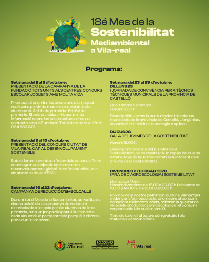 Amb l’inici del mes d’octubre Vila-real comença les activitats del Mes de la Sostenibilitat Mediambiental, que en la seua 18a edició tornarà a centrar gran part de les seues accions en la conscienciació entre els escolars, sense oblidar la tradicional gala i lliurament de premis; a més, enguany el programa incorpora la I Fira d’Agroecologia i Sostenibilitat que se celebrarà en la plaça Major l’últim cap de setmana d’octubre.