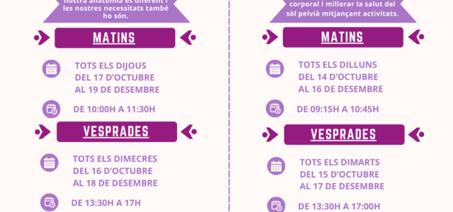‘Consciència corporal i salut del sòl pelvià’, serà impartit per la fisioterapeuta Àngela Monfort, que proposa com a objectiu millorar la salut del sòl pelvià i fomentar l’autoconeixement corporal a través de tècniques de respiració i mobilitat.