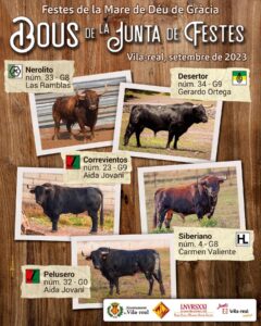 L’associació festera ha mostrar per xarxes socials els cinc bous que patrocinaran, que tenen els següents noms: ‘Nerolito’, de la ramaderia Las Ramblas, ‘Desertor’, de Gerardo Ortega, ‘Correvientos’ i ‘Pelusero’, de Aida Jovani i ‘Siberiano’, de Carmen Valiente.