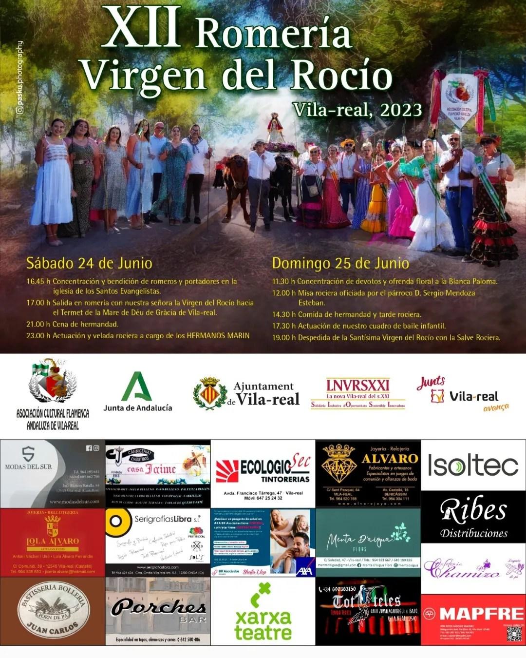L’Associació Cultural Flamenca Andalusa de Vila-real ha organitzat per a aquest cap de setmana la XII Romería a la Virgen del Rocío. Els actes començaran el dissabte 24 de juny a les 16.45 hores amb la concentració i benedicció de romers i portadors a l’església dels Sants Evangelistes. A les 17.00 hores donarà eixida la romeria cap al Termet de la Mare de Déu de Gràcia. Per la nit, a les 21.00 hores, sopar de germanor i posteriorment actuació i vetllada rociera.