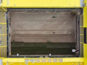 Amb les localitats ja quasi instal·lades, els operaris estan plantant la gespa perquè estiga en perfectes condicions de cara al retorn de l’afició a la seua llar.