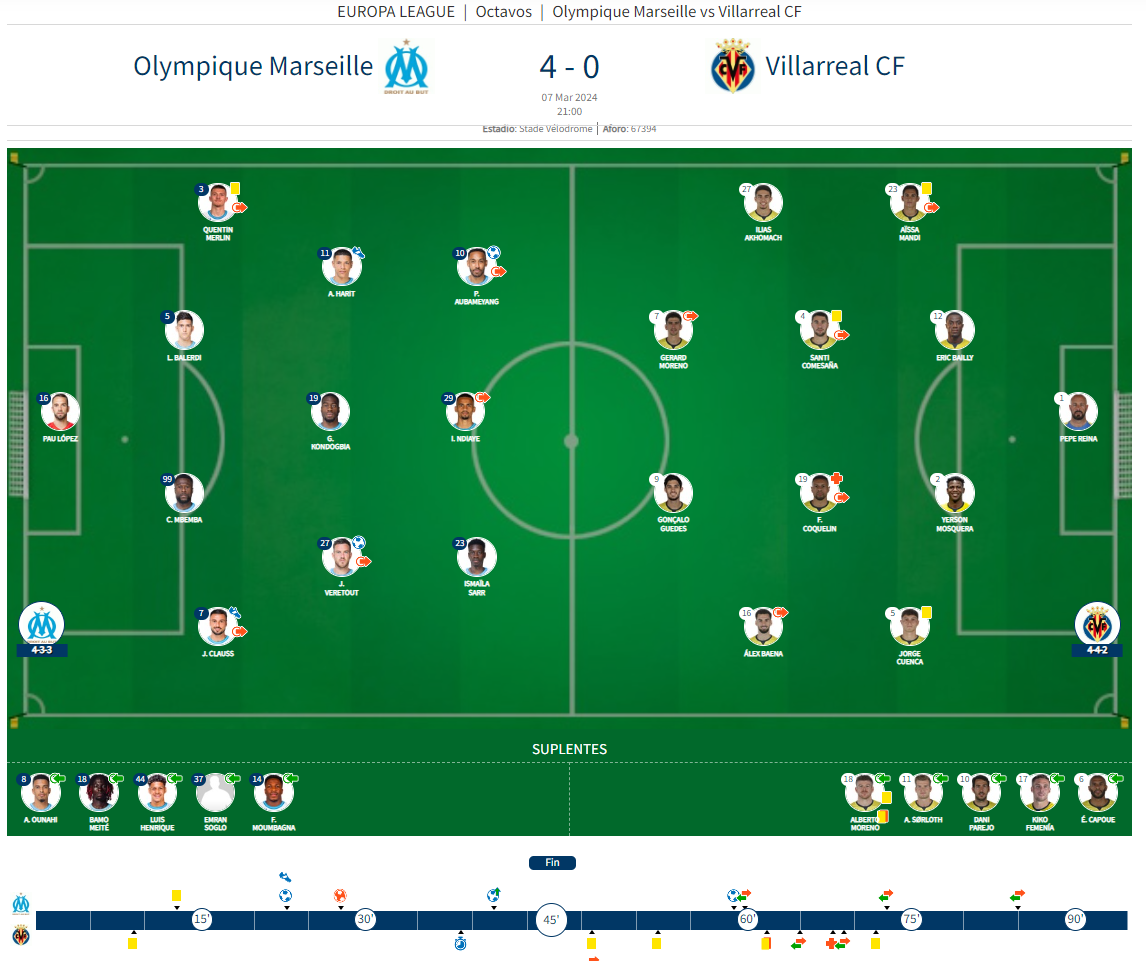 El Submarí el va intentar durant els minuts inicials del segon temps, però el Marsella va continuar sent el clar dominador d’un partit que se li posaria més de cara amb el 4-0 anotat en un contraatac per Aubameyang en el minut 58 i amb l’expulsió d’Alberto Moreno minuts després.