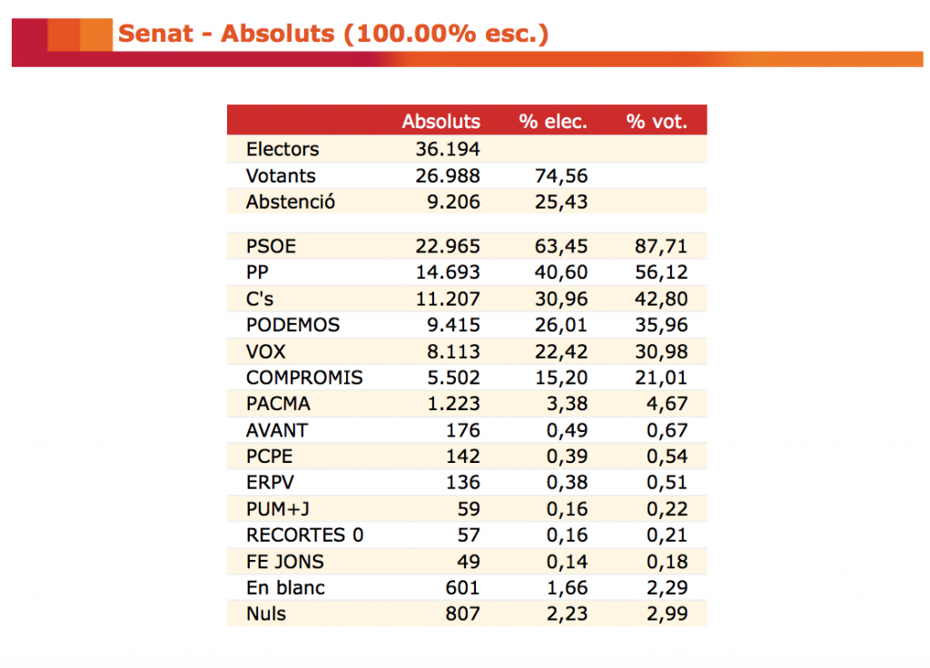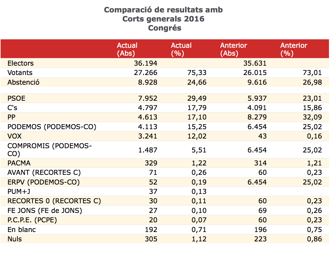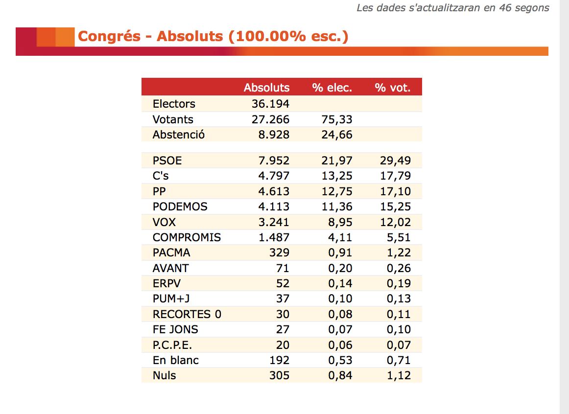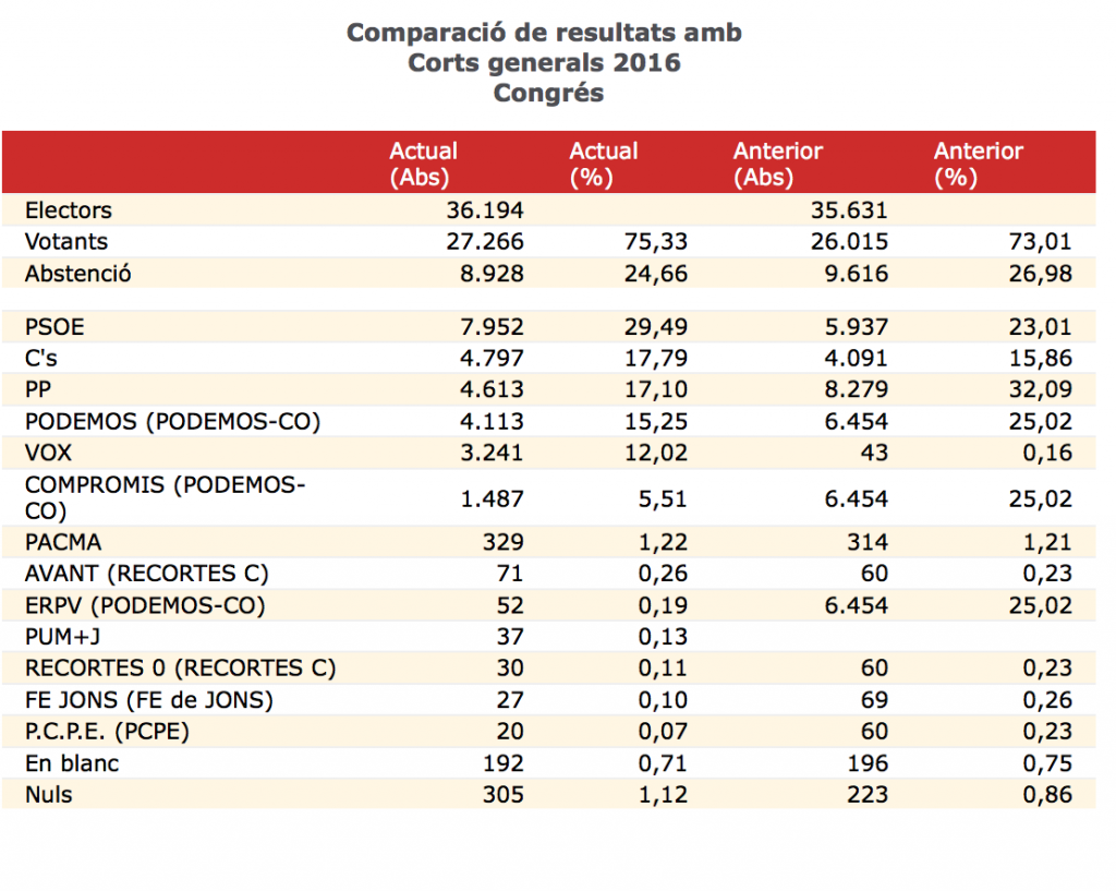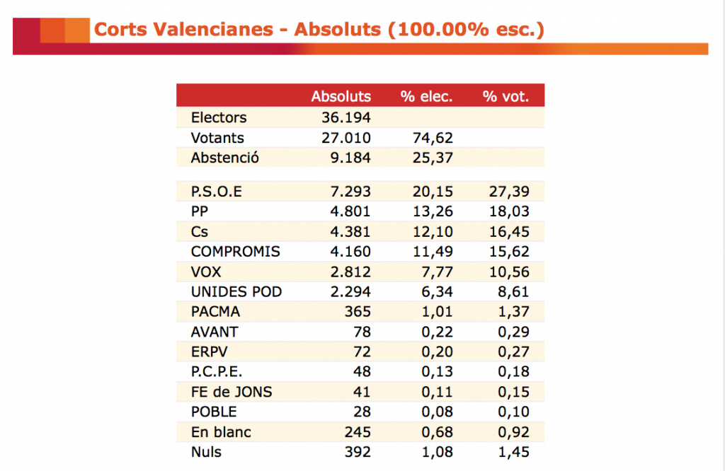 Els populars obtenen a la ciutat més de 4.000 vots menys i la formació valencianista baixa prop d'un 20%. Un total de 36.194 electors...