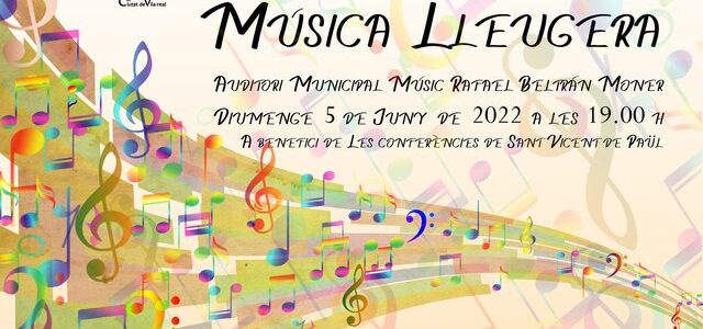 Aquest diumenge 5 de juny de tindrà lloc a l’Auditori Municipal Músic Rafael Beltrán Moner el concert de Música Lleugera, a càrrrec del Cor Ciutat de Vila-real, a les 19:00 hores.