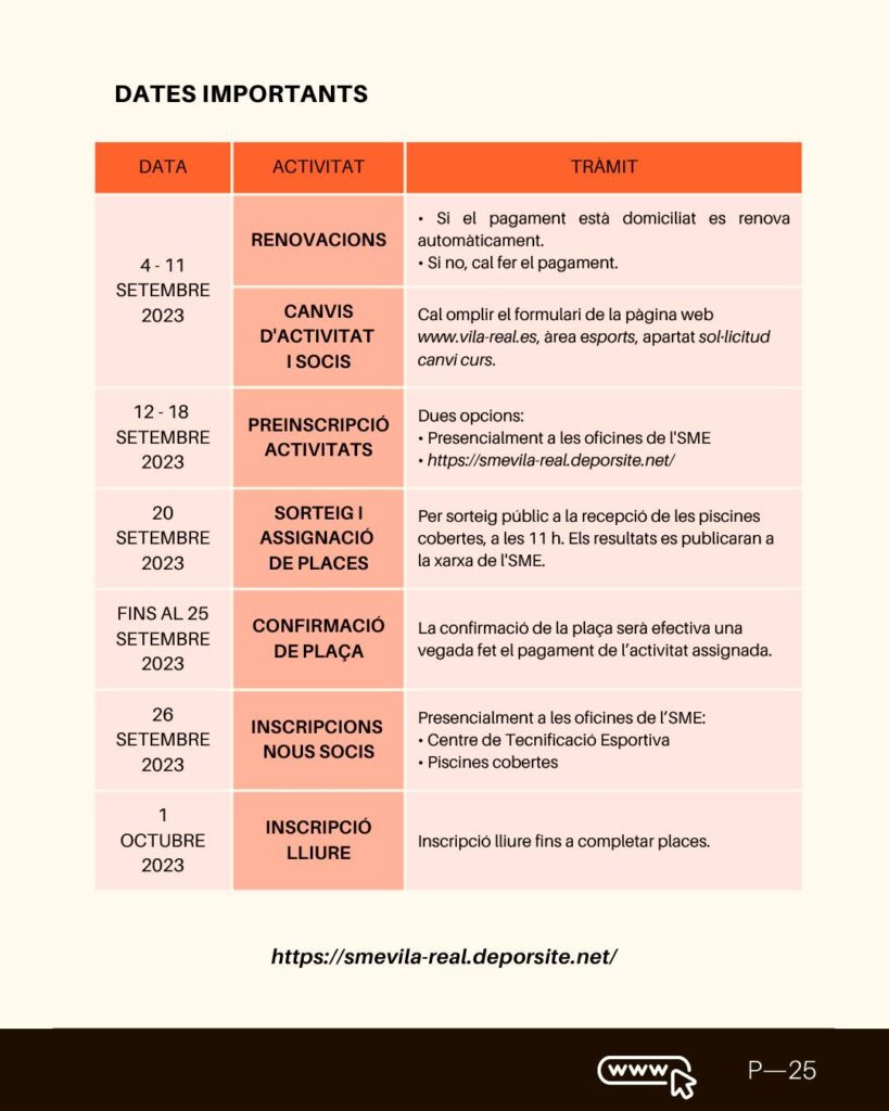 Aquest mes de setembre s’ha dedicat per a organitzar el servei municipal d’esports. Així, els gimnasos han estat tancats per als socis i no s’han fet les activitats. El retorn al curs escolar en aquest aspecte comença en Vila-real al mes d’octubre, quan ja es podrà accedir a tots els serveis que s’ofereixen des de l’SME. Aquest dimarts ha començat la fase d’inscripció de nous socis, que continuarà oberta durant tot el curs i no es tancarà.
