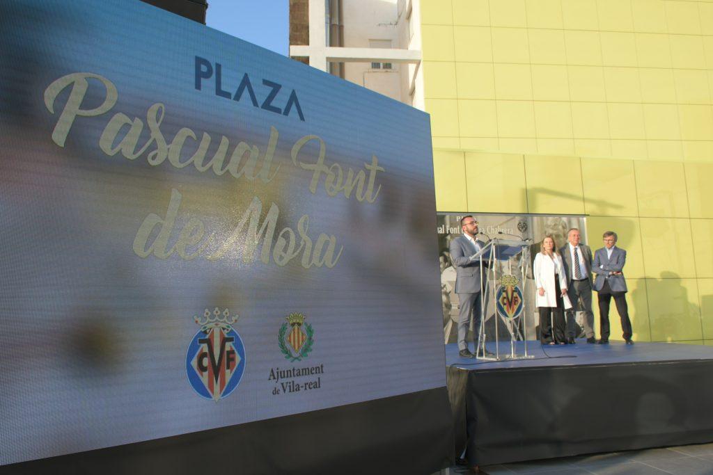 L’acte d’inauguració de la plaça en homenatge al qual va ser president del club va ser molt emotiu. La presentació va comptar amb la presència dels familiars de Font de Mora i de l’alcalde de Vila-real, José Benlloch. Els fills de Pascual Font de Mora, María José i Joaquín van destapar una placa commemorativa integrada en la pròpia plaça en la qual es poden veure diverses fotografies d’alguns dels moments viscuts per Pascual Font de Mora durant tota la seua trajectòria al Villarreal. María José va realitzar un sentit discurs en honor al seu pare, que va estar lligat a l’entitat groga durant més de mig segle: primer com a jugador, després com a directiu i finalment com a president. També va prendre la paraula l’alcalde de Vila-real, José Benlloch, per a recordar a una figura molt important en la història del club.