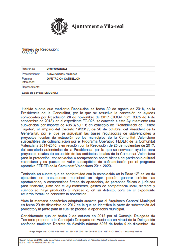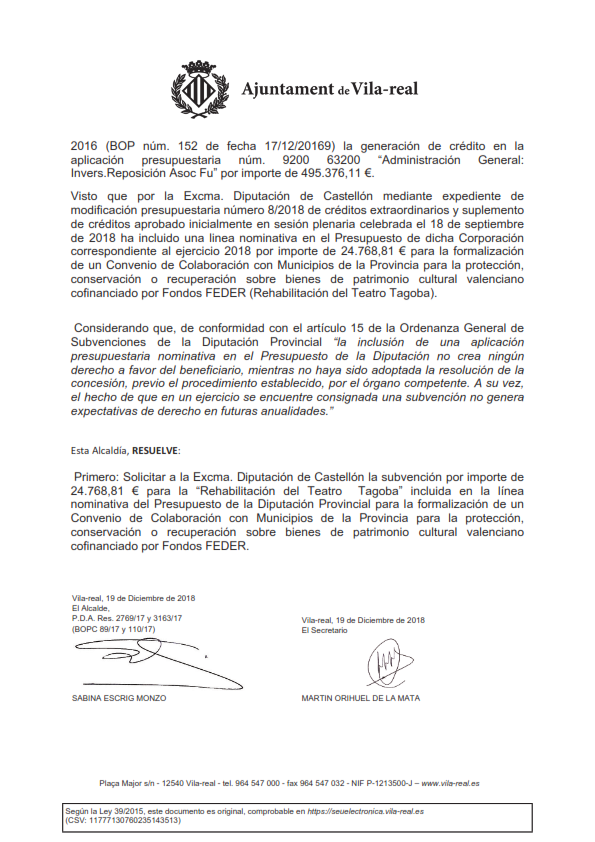 No obstant això, el PP de Vila-real ha desmentit amb rotunditat aquest fet ja que l’Ajuntament sí que va demanar les dues ajudes i la va perdre (com consta en les actes de les comissions de la Diputació de Castelló) per no haver sabut justificar la despesa. Es tracta de dues ajudes, una de 24.678 euros i una altra de 12.982 euros. La primera es tracta de la reforma del Teatre Tagoba i la segona destinada al Gran Casino. En cap dels dos casos l’Ajuntament ha justificat correctament la despesa, la qual cosa ha fet que es perden els diners.