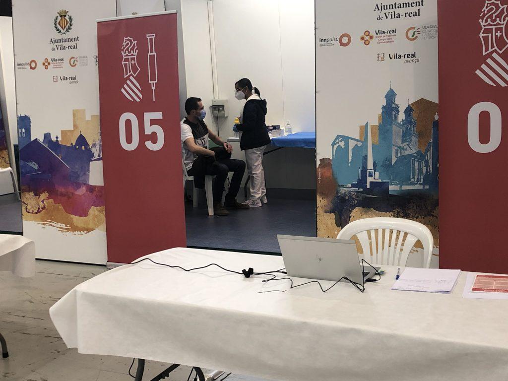 A Vila-real s’ha mobilitzat a 30 efectius, entre Policia Local i Protecció Civil, a més de 50 sanitaris, amb la finalitat de vacunar a un total de 6.000 persones en quatre dies. El punt de vacunació de Vila-real compta amb 11 boxs, habilitats a partir dels estands de què disposa el Centre de Congressos.