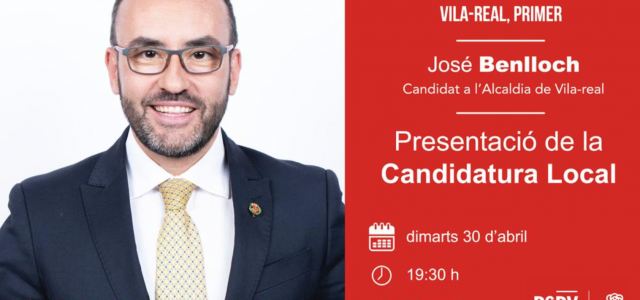Aquesta vesprada el PSOE de Vila-real presenta la candidatura que acompanya al candidat i alcalde, José Benlloch, per a les eleccions municipals del 26 de maig. Serà a les 19.30 en El Molí, al Termet de la Mare de Déu de Gràcia.