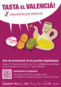 Durant aquest mes de setembre, les tres entitats organitzadores –la Regidoria de Normalització Lingüística, l’AC Socarrats i Escola Valenciana– recolliran les inscripcions tant de voluntaris com d’aprenents de Vila-real. Tenint en compte la disponibilitat i les preferències de cada persona, es confeccionaran els tàndems lingüístics del Voluntariat presencial, una iniciativa adreçada a la població adulta, major de 18 anys.