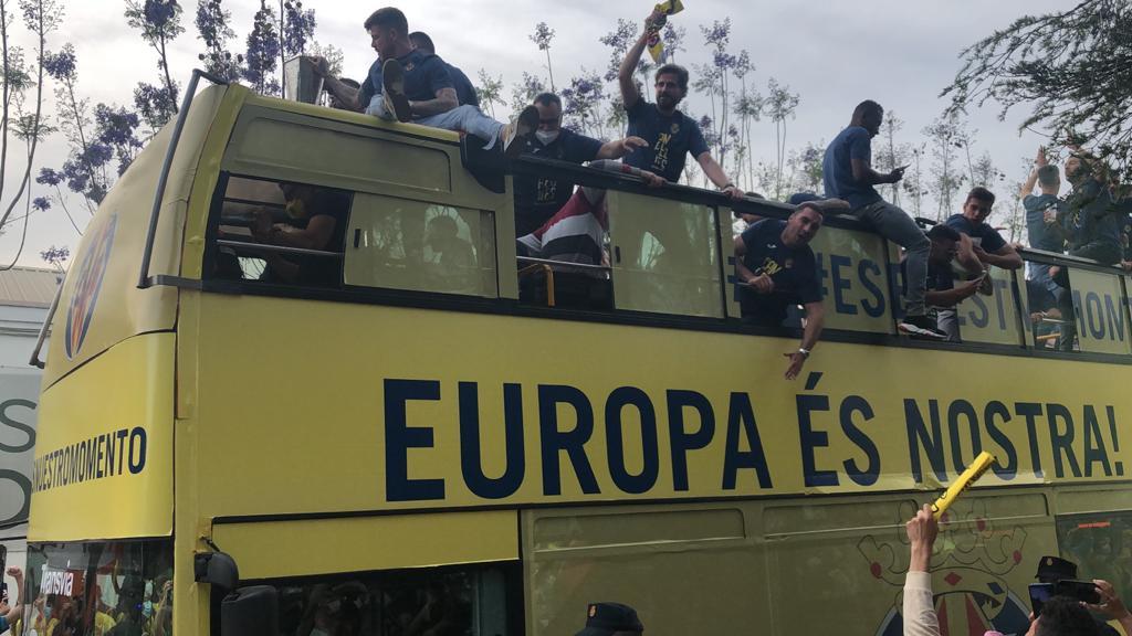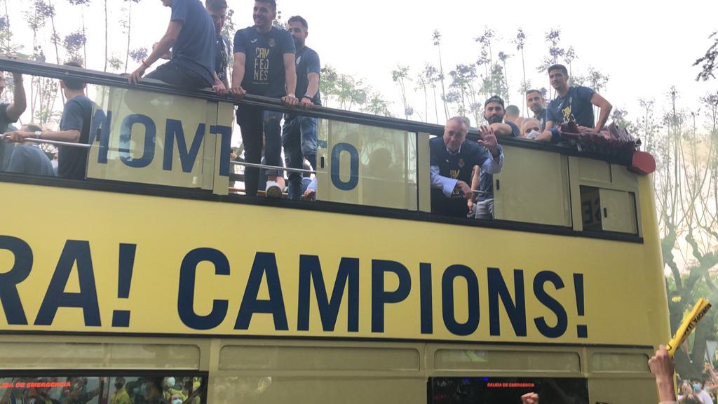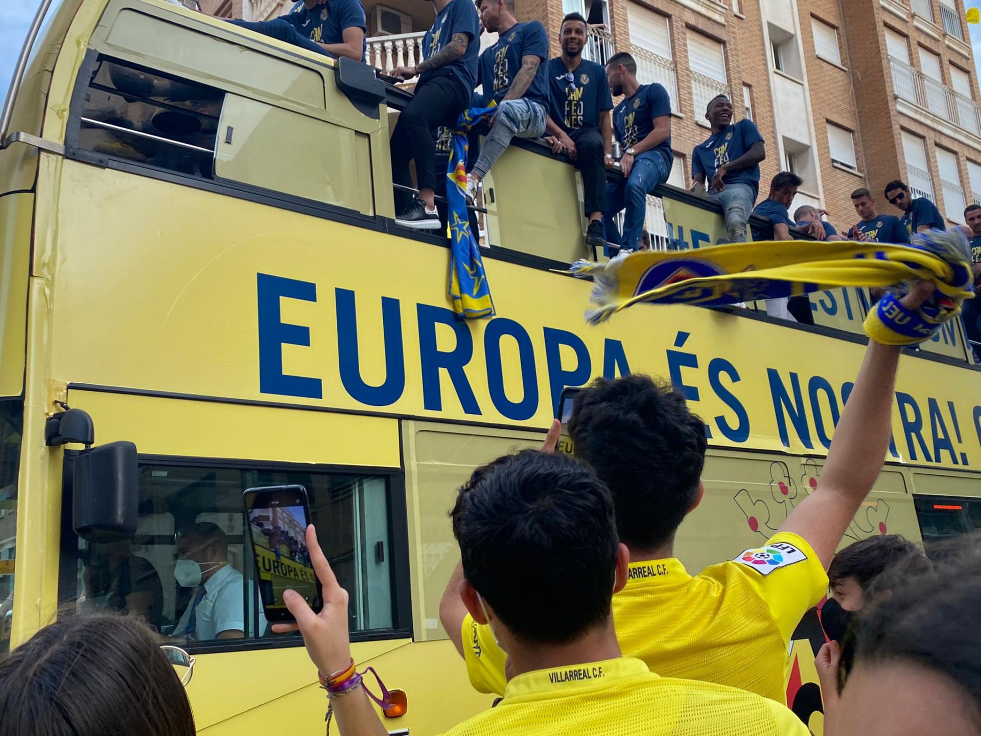En l’autobús d’una banda es podia llegir ‘Som Campions’, d’una banda, i per l’altra ‘Europa és nostra’ ‘Campions’. Escortats per la policia local, arranque el recorregut pels carrers sembrats de seguidors del Vila-real, tots abillats amb indumentària groga. I és que, pel que sembla, a la botiga del club vila-realenc es va esgotar tot el material: samarretes, bufandes i dessuadores. La copa va ser de mà en mà, sempre en el més alt de l’autobús.