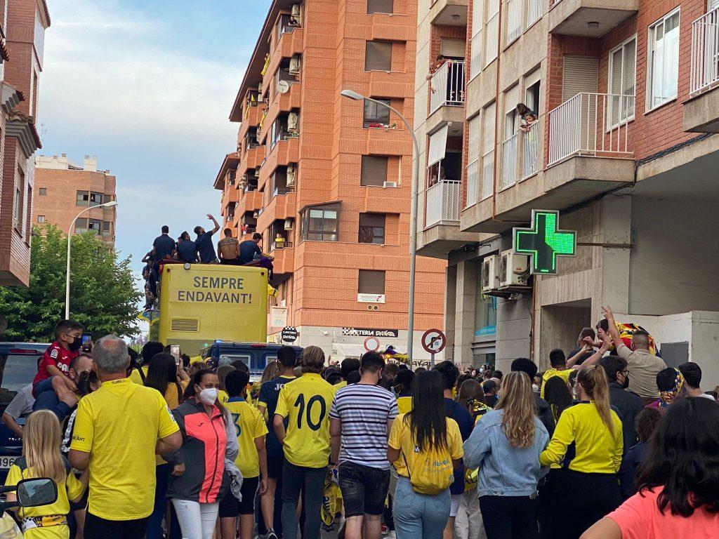 Quasi impossible transitar pels carrers, abarrotades de públic. La rúa ha arrancat a les 19.30 hores, amb mitja hora de retard. El primer a pujar en l’autobús va ser el president Fernando Roig, i després els jugadors que semblaven anar uniformats perquè tots anaven vestits igual, amb una samarreta especial blava marí en la qual es podia llegir CAM-PEO-NES. El màxim responsable del club li la va enfundar una vegada damunt del vehícle.