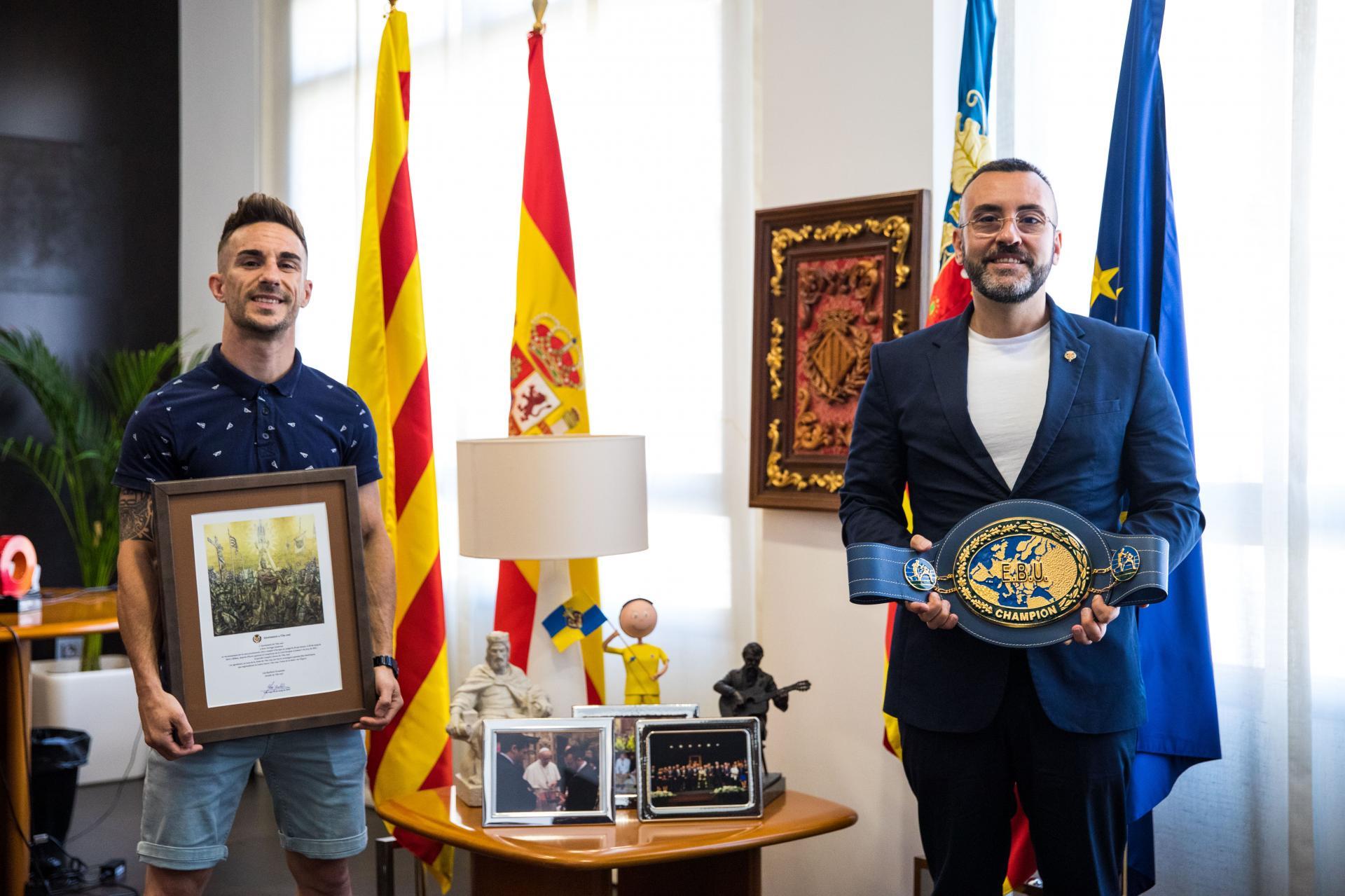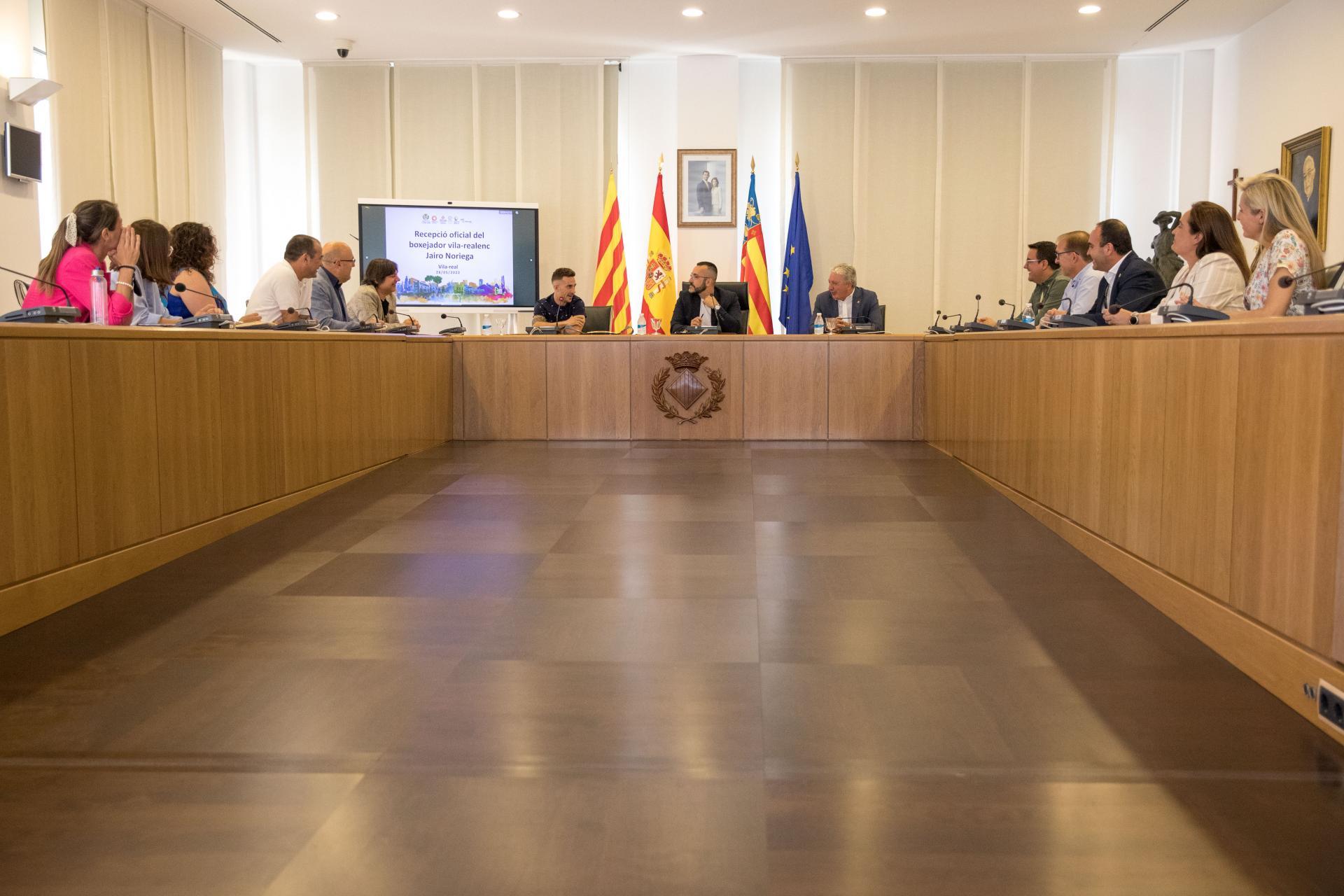El boxejador vila-realenc Jairo Noriega ha visitat hui al saló de plens de l’Ajuntament de Vila-real. L’esdeveniment ha estat presidit per l’alcalde, José Benlloch, i ha comptat també amb la presència dels regidors i regidores de la corporació municipal.