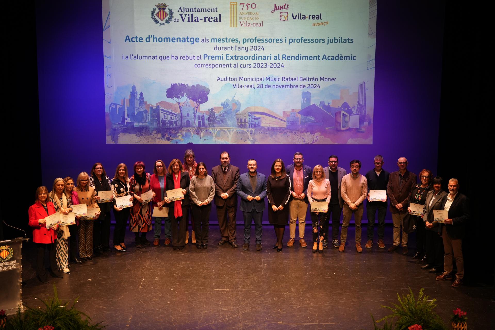A més, en un moment molt especial de la gala, s’ha rendit homenatge als mestres jubilats de Vila-real, amb un total de 20 reconeixements a docents que han finalitzat la seva trajectòria professional al llarg de l’any 2024. L’alcalde i la regidora Anna Vicens han destacat la seva vocació, la seva influència en la formació dels joves i la seva tasca imprescindible per fomentar l’interès pel coneixement.