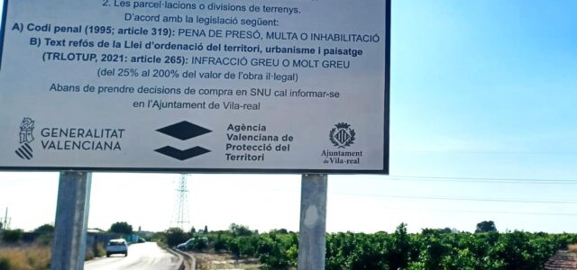 L’Ajuntament de Vila-real, en el seu compromís pel compliment de la legislació en matèria urbanística i la protecció dels espais en els quals no està permesa la construcció, i atenent a les indicacions de l’Agència Valenciana de Protecció del Territori, ha reforçat la informació a la ciutadania per a advertir de les conseqüències judicials que suposa la construcció en sòl no urbanitzable.