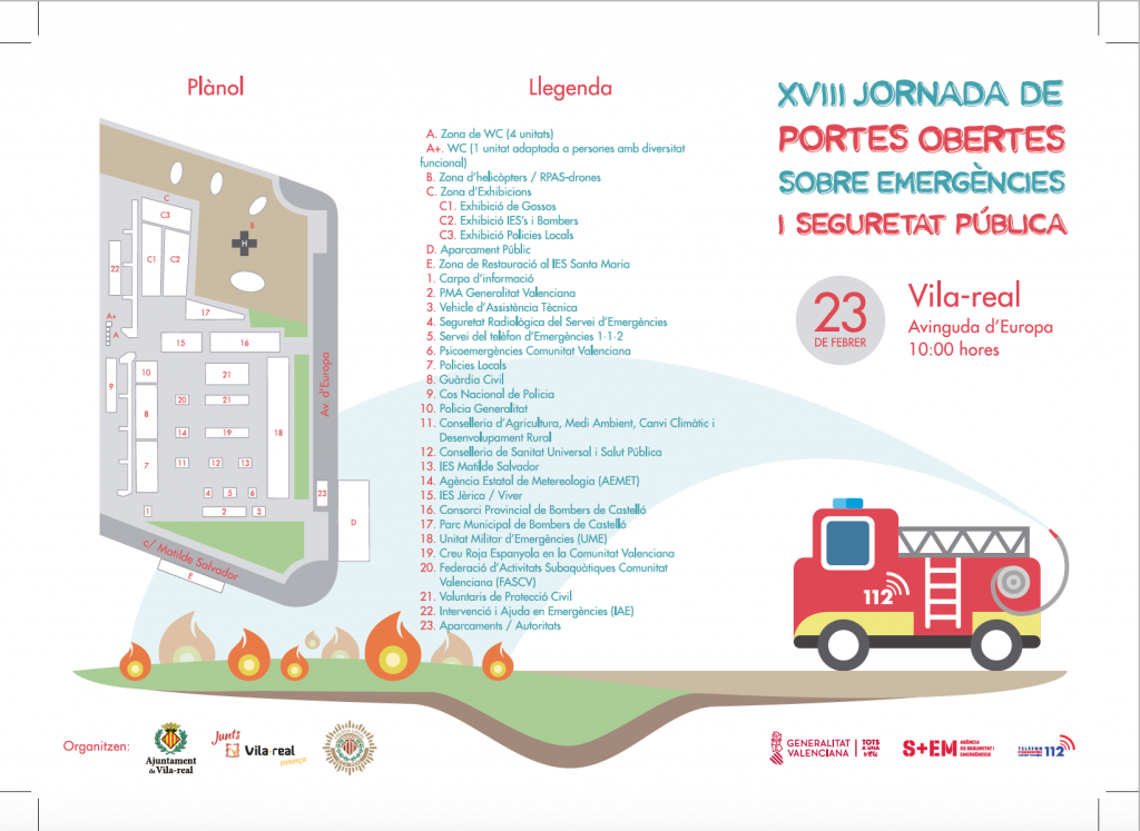 Vila-real es convertirà el pròxim dissabte en un gran aparador dels recursos tècnics i humans de diversos cossos de seguretat i de resposta a emergències. I és que la ciutat, que celebra aquest més la seua fundació fa 745 anys, ha sigut elegida per l’Agència Valenciana de Seguretat i Resposta a les Emergències per a acollir la XVIII Jornada de Portes Obertes d’Emergències i Seguretat Pública que reunirà a l’aparcament municipal de l’avinguda d’Europa, enfront del Palau de Justícia a més de 300 professionals de 22 organismes relacionats amb l’actuació en tot tipus d’emergències, en una autèntica exhibició dels recursos disponibles –helicòpters, globus sonda, cavalls, camions de bombers, drons, investigació criminal, lloc de comandament avançat…- en la Comunitat per a fer front a aquest tipus de situacions. La fira, eminentment pedagògica, estarà oberta el dissabte, 23 de febrer, de 10.00 a 17.00 hores.